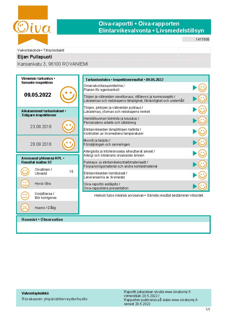 Eijan Pullapuoti on pieni paikallinen leipomo, joka on palvellut Rovaniemen herkkusuita jo yli 20 vuotta. Poikkea puotiimme ostoksille tai tilaa tarvitsemasi tuotteet etukäteen; vitriinituotteiden ohella valmistamme tilauksesta niin kakkuja, voileipäkakkuja, piirakoita kuin muitakin tuotteita ja pystymme huomioimaan myös erilaiset ruoka-aineallergiat sekä vegaanit. Vaikka meillä on tarjoilla tuoreita, paikan päällä paistettuja lähileipomuksia aina avaamisesta iltapäivään, ne parhaat pullat tuppaavat tunnetusti menemään jo heti aamusta. Tulethan siis ajoissa nappaamaan mieleisesi herkut mukaan – pullapuodin ovet aukeavat jo aamuseitsemältä.